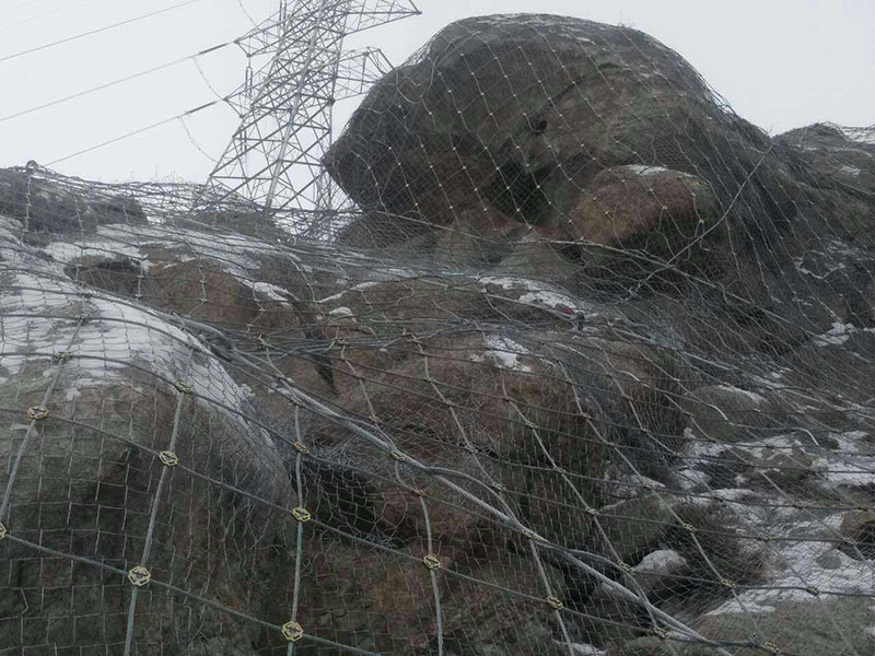 2)鋼絲繩網的編制 鋼絲繩網的編制應滿足以下要求: 上下交錯編織;編制成網的鋼絲繩不得有斷絲、脫絲現象;交叉節點處用扣壓件固定,接頭處用搭接件壓接, 不得遺漏,鋼繩露出搭接件長度至少為10mm;編網時扣壓件和搭接件用機械壓接,表面不得有破裂和明顯損傷;網的形狀平整、繩不得有打結明顯扭曲現象。