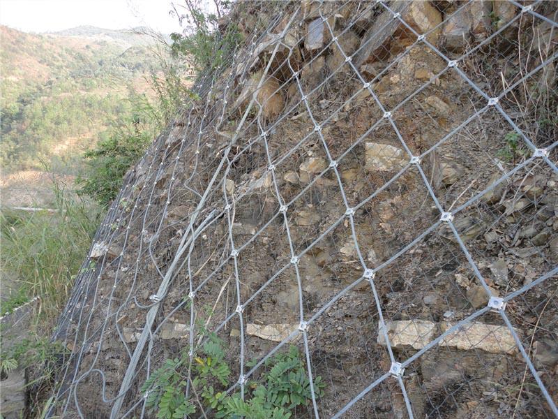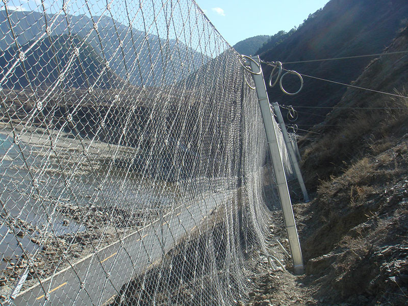 2. 每組被動防護網上下都有兩個支撐繩將立柱與鋼絲繩網緊密的結合在一起,起到共同防護的效果,支撐繩的直徑一般為∮18,可以對落石進行有效的攔截。